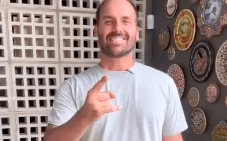 Vídeo em que o deputado Eduardo Bolsonaro (PL-SP) pilota anúncio de camisetas viralizou nas redes sociais. Vendedor bissexto, o filho 03 do ex-presidente Jair Bolsonaro aparece na peça ridiculamente pulando e depois exibindo no próprio corpo camisetas da grife Lucinha Correia.