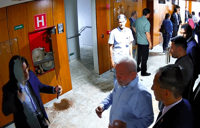 Em determinado momento, Lula passa em frente ao seu gabinete, em meio a uma comitiva de ministros e auxiliares, e gesticula muito diante dos sinais de vandalismo, demonstrando irritação.