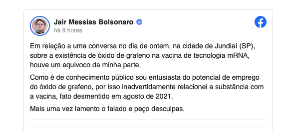 “Em relação a uma conversa no dia de ontem (17/6), na cidade de Jundiaí (SP), sobre a existência de óxido de grafeno na vacina de tecnologia mRNA, houve um equivoco da minha parte. Como é de conhecimento público, sou entusiasta do potencial de emprego do óxido de grafeno, por isso inadvertidamente relacionei a substância com a vacina, fato desmentido em agosto de 2021. Mais uma vez lamento o falado e peço desculpas”, postou nas redes sociais neste domingo (18/6).
