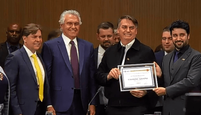 Em cerimônia prestigiada pelo governador Ronaldo Caiado (União Brasil), o ex-presidente Jair Bolsonaroo (PL) recebeu Título de Cidadania Goiana na noite desta sexta-feira (18), na Assembleia Legislativa de Goiás.