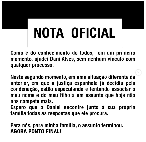 “Como é do conhecimento de todos, em um primeiro momento, ajudei Dani Alves, sem nenhum vínculo com qualquer processo”, disse o pai de Neymar em nota oficial no seu pefil no Instagram.