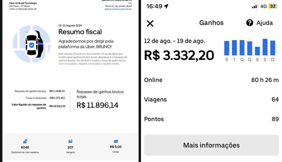 Carlos de Campos, motorista de 65 anos, revelou que trabalha de segunda a sábado e tira R$ 8 mil por mês, já com o desconto de 22% da Uber. Seu maior gasto é o combustível: cerca de R$ 2.080 por mês. Além disso, ele gasta R$ 240 com seguro e até R$ 400 em manutenções. Com despesas extras, como alimentação e IPVA, seu lucro final gira em torno de R$ 5.500.