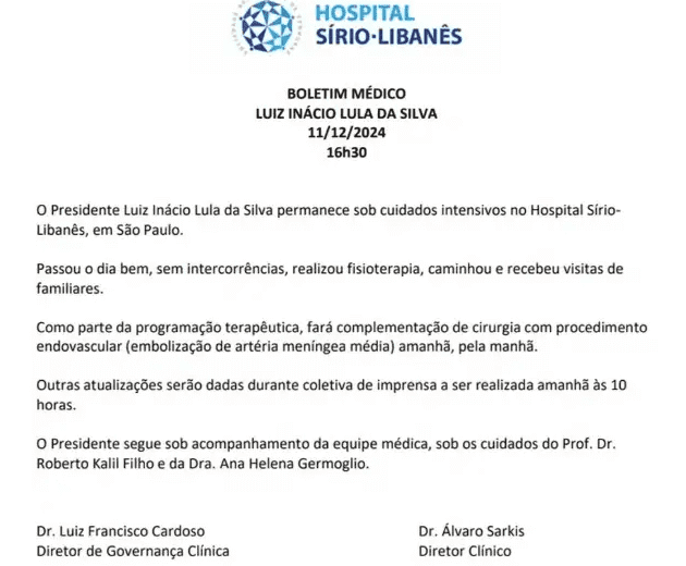 O presidente Luiz Inácio Lula da Silva (PT) deve passar por novo procedimento para interromper o fluxo de sangue em uma região de seu cérebro e impedir novos sangramentos.