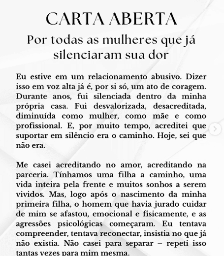 No texto, a parlamentar relata que vivia em um relacionamento abusivo e conta que durante anos foi silenciada em sua própria casa. “Fui desvalorizada, desacreditada, diminuída como mulher, como mãe e como profissonal”, assinala.
