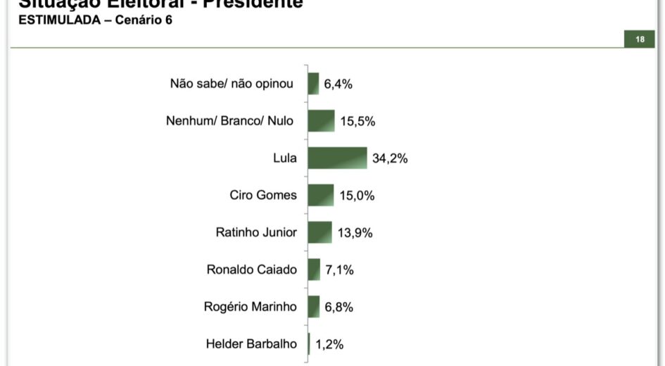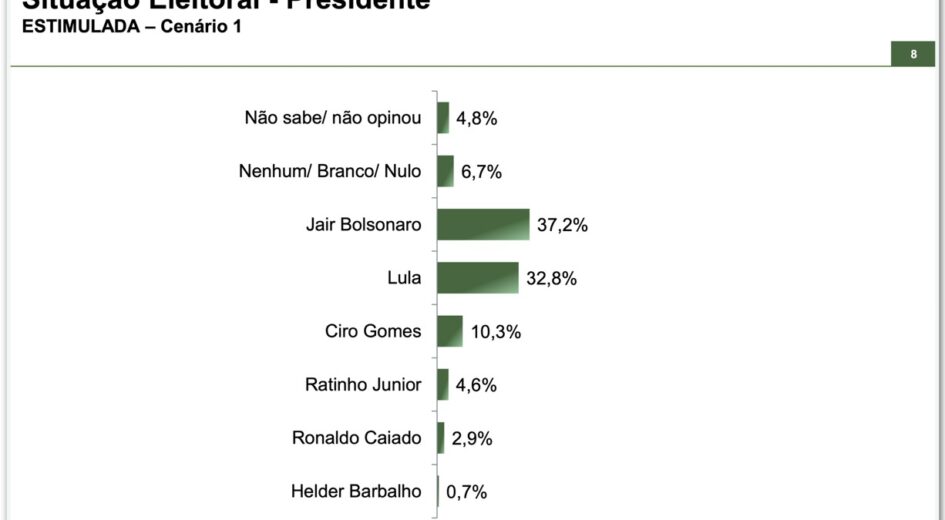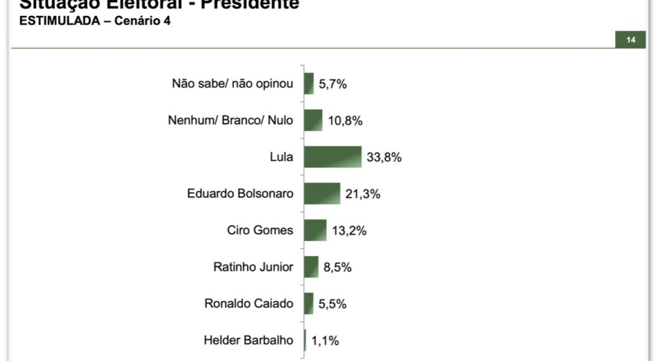 Quando o governador de São Paulo, Tarcísio de Freitas (Republicanos), é o nome da direita bolsonarista, Lula aparece na frente do gestor estadual com 34% a 24,3%. Já contra o deputado federal Eduardo Bolsonaro (PL-SP), o resultado é 33,8% a 21,3% para o atual presidente.