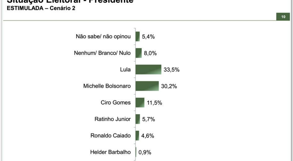 O presidente Luiz Inácio Lula da Silva (PT) empata em intenções de voto com o ex-presidente Jair Bolsonaro (PL) e com a ex-primeira-dama Michelle Bolsonaro (PL) dentro da margem de erro (2,2 pontos percentuais), segundo o instituto Paraná Pesquisas. O levantamento foi divulgado nesta terça-feira (24).