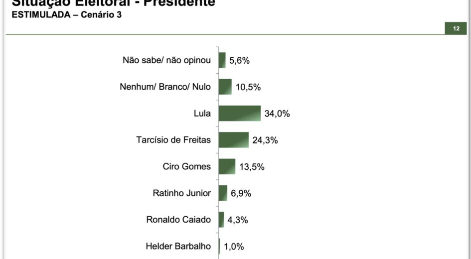 Quando o governador de São Paulo, Tarcísio de Freitas (Republicanos), é o nome da direita bolsonarista, o petista aparece na frente com 34% a 24,3%