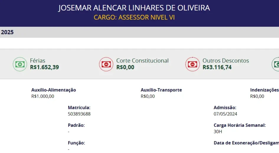 Josemar Alencar Linhares de Oliveira consta no portal da transparência da Assembleia como assessor nível VI comissionado, uma vez que, no site, a referência ainda é o mês de junho. À TV Anhanguera, a informação é de que o homem já foi exonerado. O Brasil24Horas não conseguiu contato com a defesa do indivíduo.