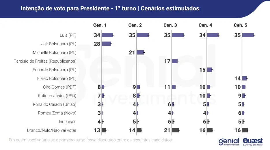 O presidente Luiz Inácio Lula da Silva (PT) lidera todos os cenários de primeiro turno, conforme pesquisa Genial/Quaest desta quinta-feira (21). Mesmo com a inclusão de Jair Bolsonaro (PL), o petista venceria o ex-presidente por 34% a 28% das intenções de voto.