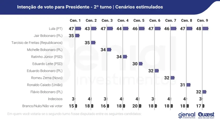 Lula também venceria os demais candidatos no segundo turno. Contra Bolsonaro, 47% a 35%; contra Tarcísio, 43% a 35%; Michelle, 47% a 34%; Ratinho, 44% a 34%; Eduardo Leite (PSDB), 46% a 30%; Eduardo Bolsonaro, 47% a 32%; Romeu Zema, 46% a 32%; Caiado, 47% a 31%; e Flávio Bolsonaro, 48% a 32%. Indecisos variaram de 3% a 4%, enquanto nulos e brancos, de 15% a 18%.