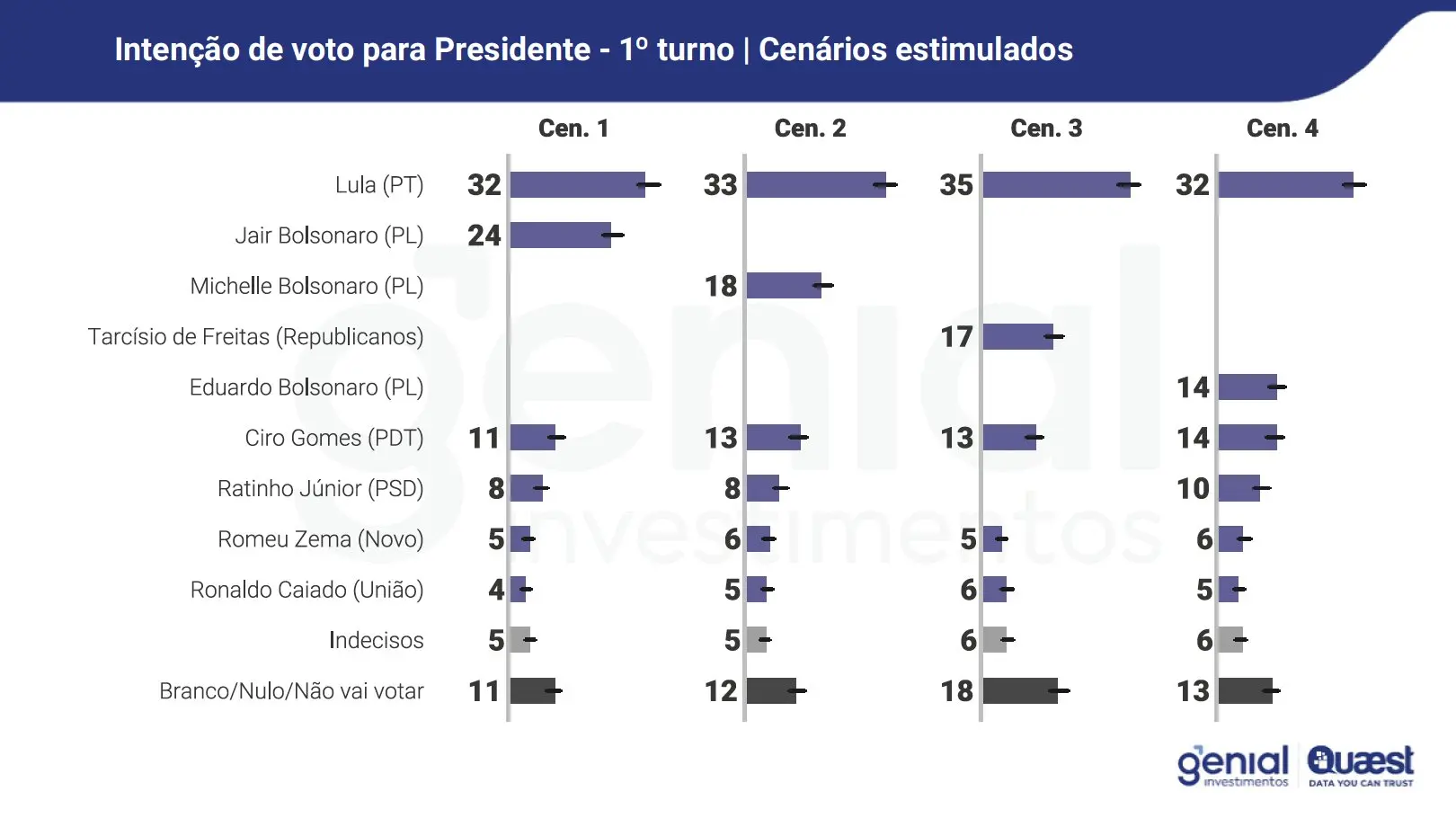“Nas simulações de 2º turno o que mais chama atenção é a competitividade de Ciro Gomes. Ele é o nome mais competitivo dentre todos os citados (7 pts). O segundo mais competitivo é Tarcisio (8 pts). O terceiro é Ratinho Jr. (12 pts). Bolsonaro é apenas o quarto mais competitivo, com a mesma distância que Zema tem para Lula (13 pt). Michelle e Caiado aparecem em seguida, com uma distância de 15 pontos. Eduardo Bolsonaro estaria 18 pontos atrás de Lula e Leite a 19 pontos”, disse Felipe.
