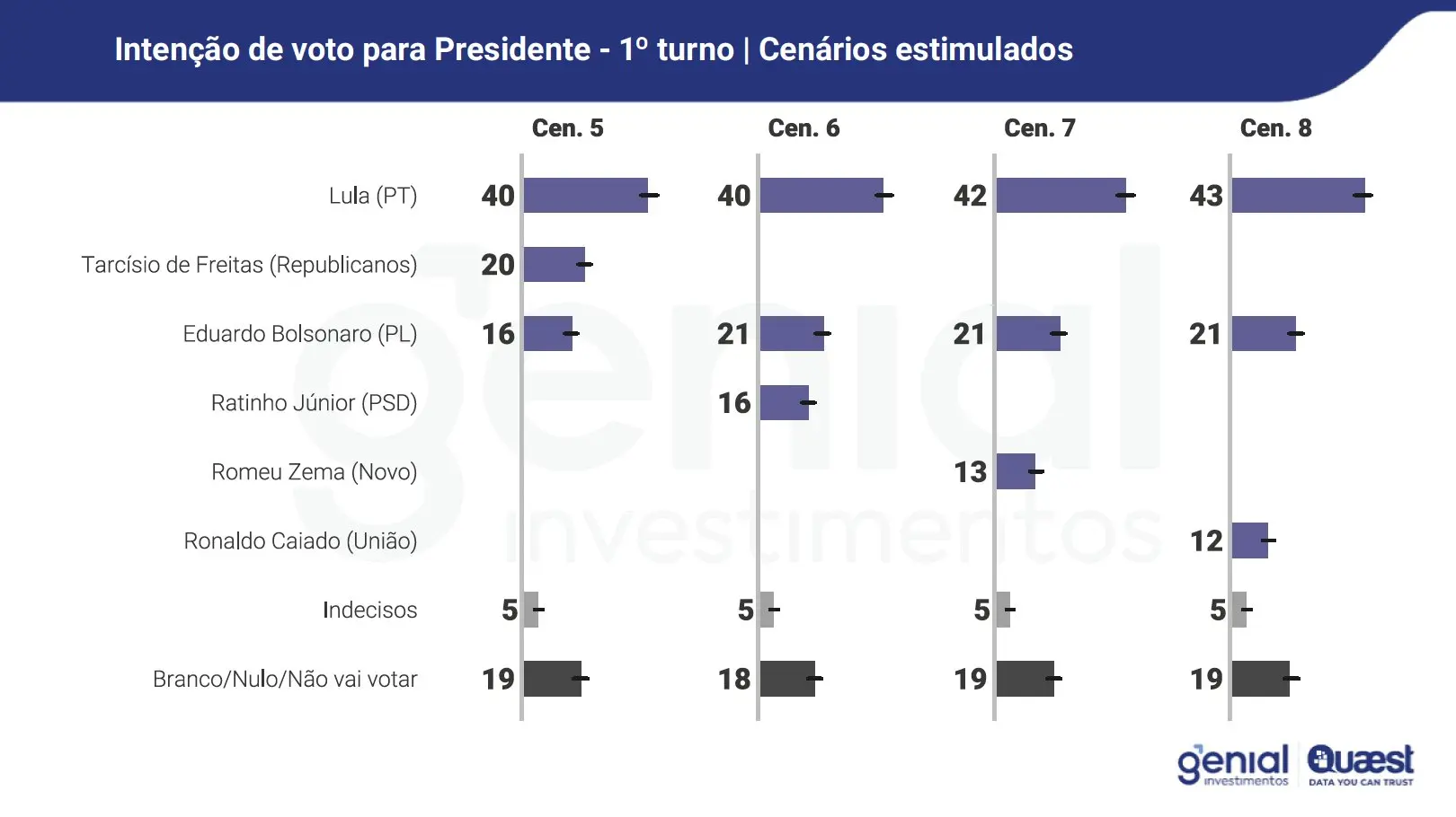 O diretor da Quaest, Felipe Nunes, observou que, a depender do cenário, o presidente Luiz Inácio Lula da Silva (PT) pode vencer as eleições de 2026 no primeiro turno. “Nos cenários em que a direita radical lança Eduardo para competir com algum outro nome da direita, Lula passa a ter chances de vencer já no 1º turno. O atual presidente teria entre 40% e 43% das intenções de voto, percentual maior que a soma dos outros dois nomes”, escreveu no X.
