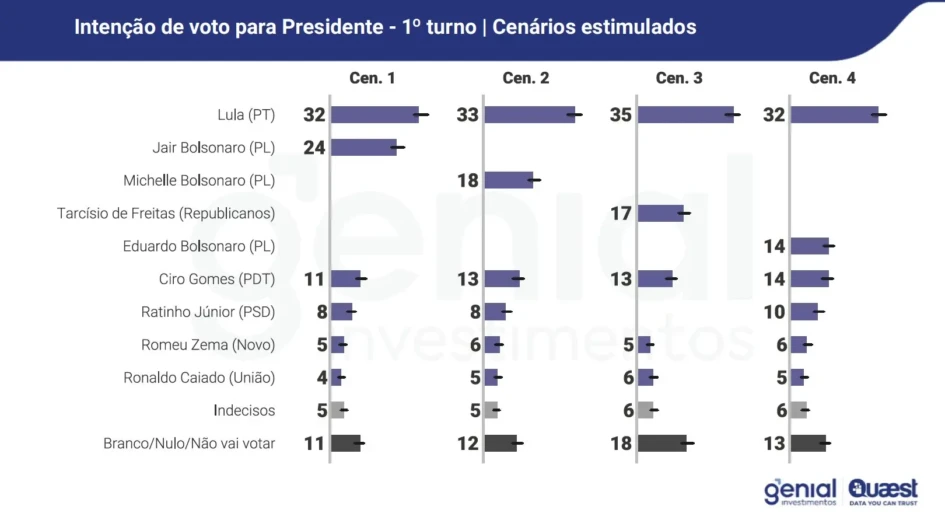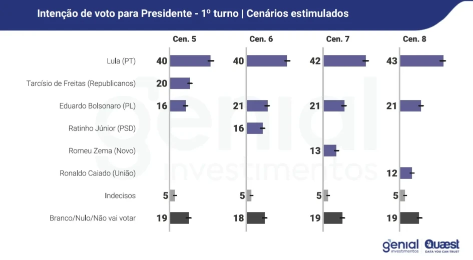 O diretor da Quaest, Felipe Nunes, observou que, a depender do cenário, o presidente Luiz Inácio Lula da Silva (PT) pode vencer as eleições de 2026 no primeiro turno. “Nos cenários em que a direita radical lança Eduardo para competir com algum outro nome da direita, Lula passa a ter chances de vencer já no 1º turno. O atual presidente teria entre 40% e 43% das intenções de voto, percentual maior que a soma dos outros dois nomes”, escreveu no X.