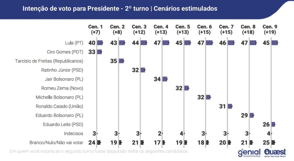 Ainda conforme o levantamento, Lula vence em todos os cenários de segundo turno. Ele teria 40% contra 33% de Ciro Gomes (PDT); 43% contra 35% de Tarcísio; 44% contra 32% de Ratinho Júnior; 44% contra 32% de Bolsonaro (PL); 47% contra 34% de Romeu Zema; 45% contra 32% de Michelle Bolsonaro (PL); 47% contra 31% de Caiado; 46% contra 29% de Eduardo Bolsonaro; e 47% contra 26% de Eduardo Leite (PSD).