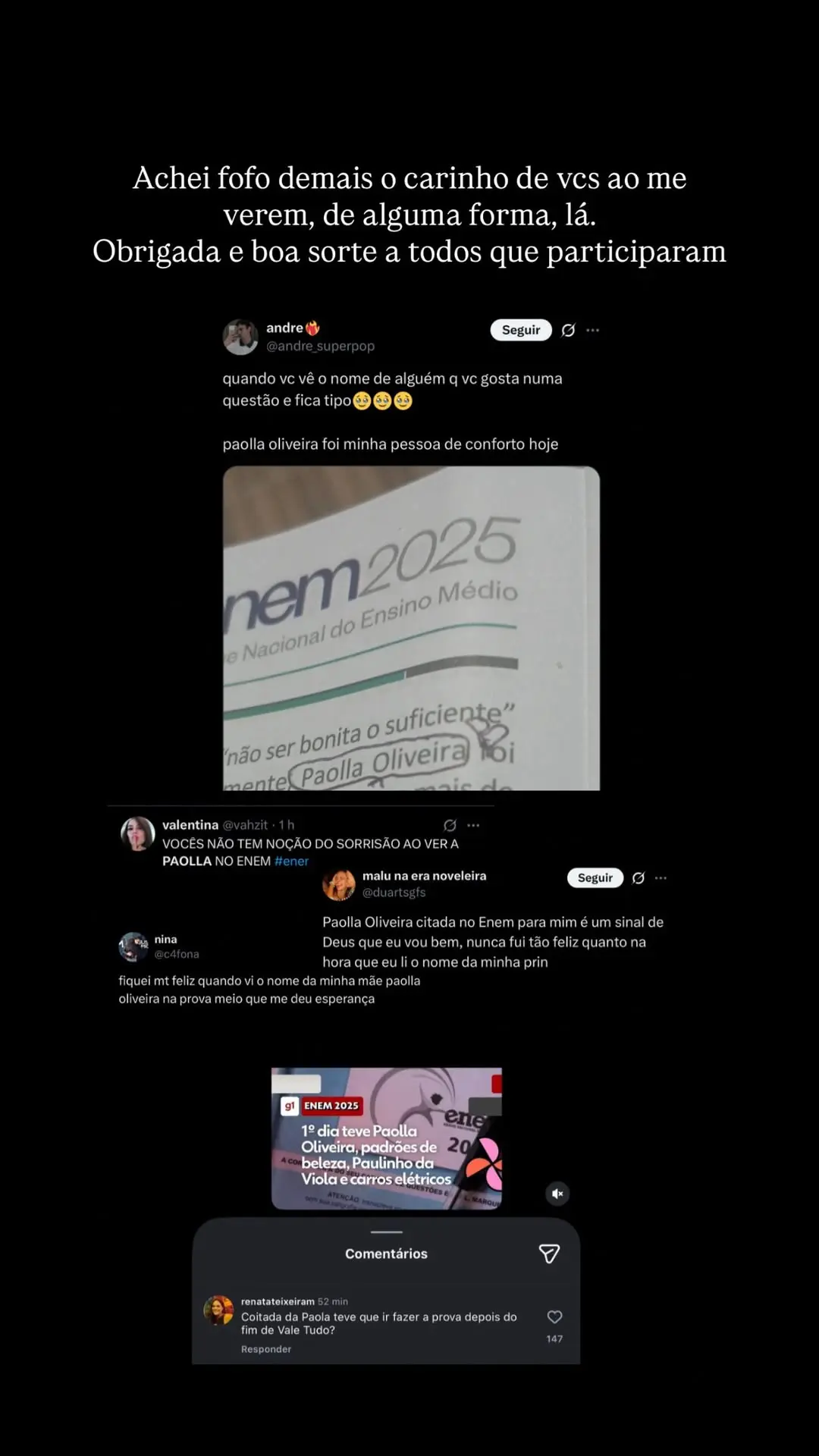 Sobre as mensagens dos internautas, uma delas afirmou: “Vocês não têm ideia do meu sorrisão quando apareceu a Paolla no Enem.” Outro disse: “Paolla Oliveira foi minha pessoa de conforto hoje.”