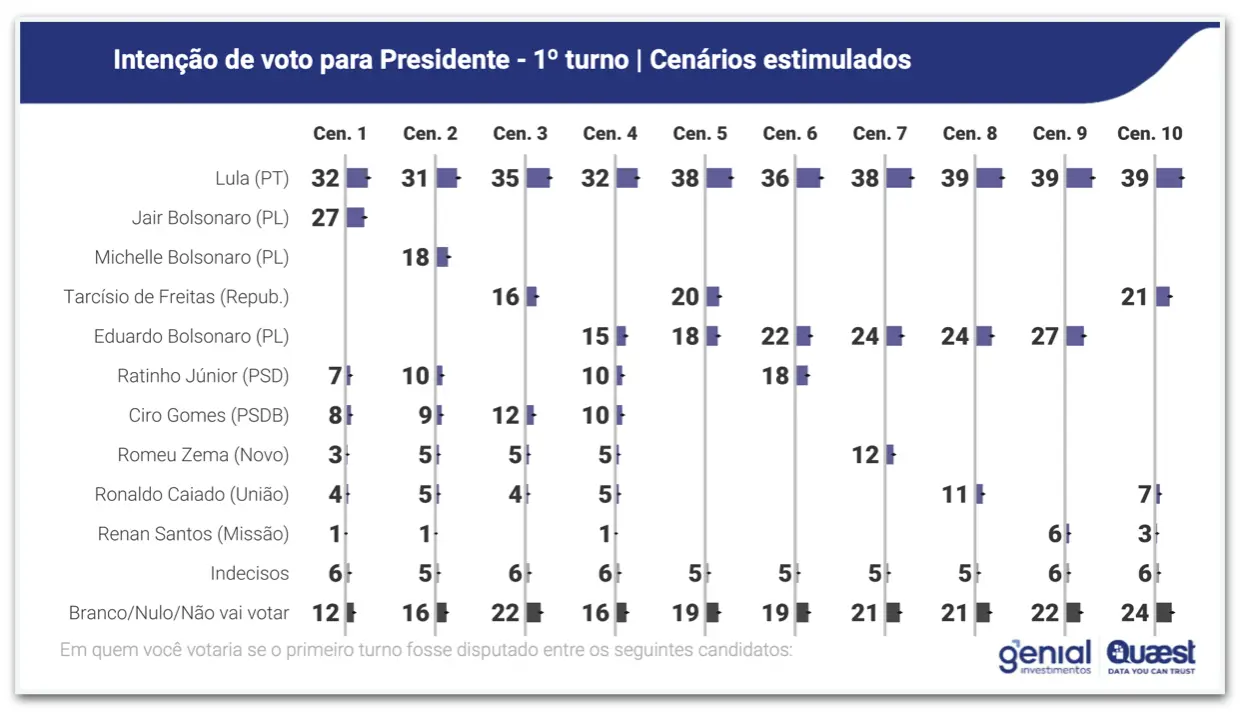 Em outubro, Lula liderava todos os cenários de 1º e 2º turno. Na primeira etapa, o presidente teria 32% contra 27% de Bolsonaro. Completam o cenário: Ciro Gomes (PSDB), 8%; Ratinho Júnior (PSD), 7%; Ronaldo Caiado (União Brasil), 4%; Romeu Zema (Novo), 3%; Renan Santos (Missão), 1%. Indecisos somaram 6% e brancos e nulos, 12%.