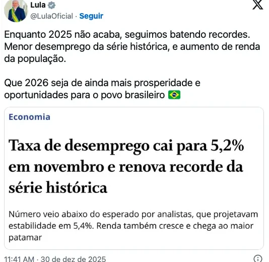 “Enquanto 2025 não acaba, seguimos batendo recordes. Menor desemprego da série histórica, e aumento de renda da população. Que 2026 seja de ainda mais prosperidade e oportunidades para o povo brasileiro”, escreveu o presidente nas redes sociais