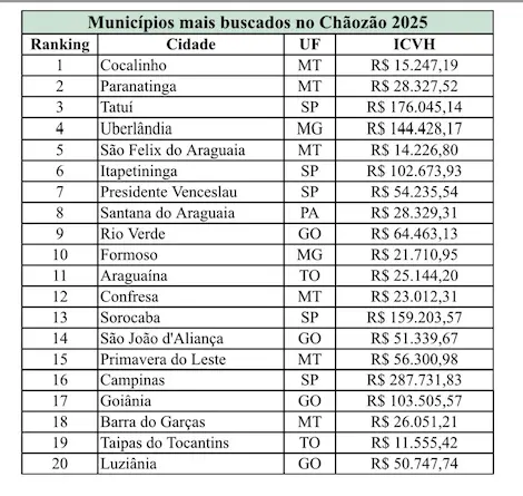 Um levantamento feito pela plataforma Chãozão, especializada em vendas de imóveis rurais, listou as 20 cidades brasileiras mais consultadas por pessoas interessadas em investir neste mercado em 2025. Os dados apontam para uma procura mais intensa na região Centro-Oeste, representada por dez municípios no ranking. Cocalinho, no Mato Grosso, ocupa a primeira posição, com o hectare custando, em média, R$ 15.247,19, segundo o Índice Chãozão Valor do Hectare (ICVH). Paratininga, no mesmo estado, aparece em seguida, com o hectare médio avaliado em R$ 28.327,52. O município de Tatuí (SP) fecha o Top 3, com R$ 176.045,16 de preço médio do hectare.