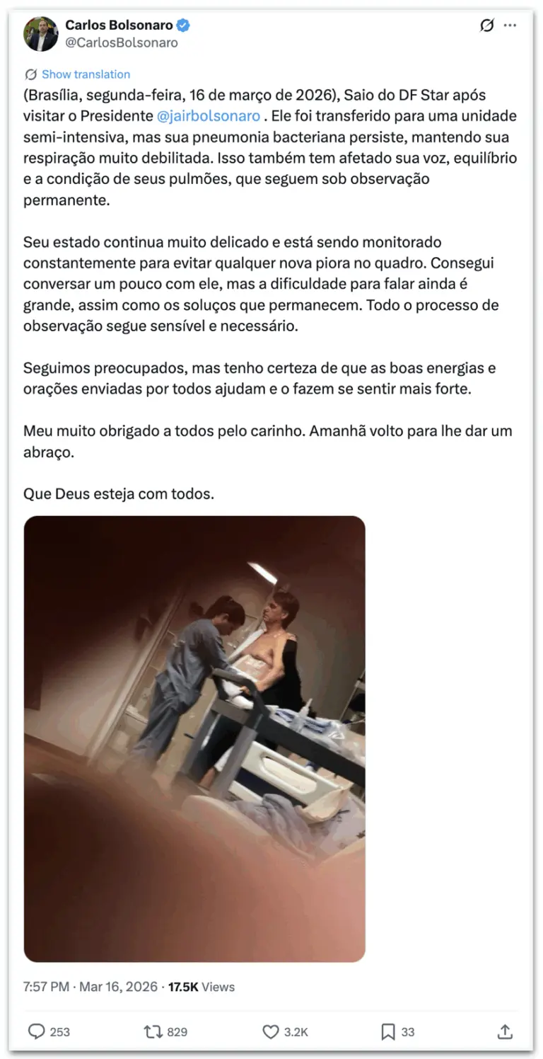 Bolsonaro foi internado na última sexta-feira (13) e segue no Hospital DF Star, em Brasília, sem previsão de alta. Conforme boletim médico de segunda-feira, o ex-presidente apresentou evolução clínica e laboratorial, com recuperação da função renal e melhora parcial dos marcadores inflamatórios. Também conforme o texto, ele “segue com suporte clínico intensivo e fisioterapia respiratória e motora”.